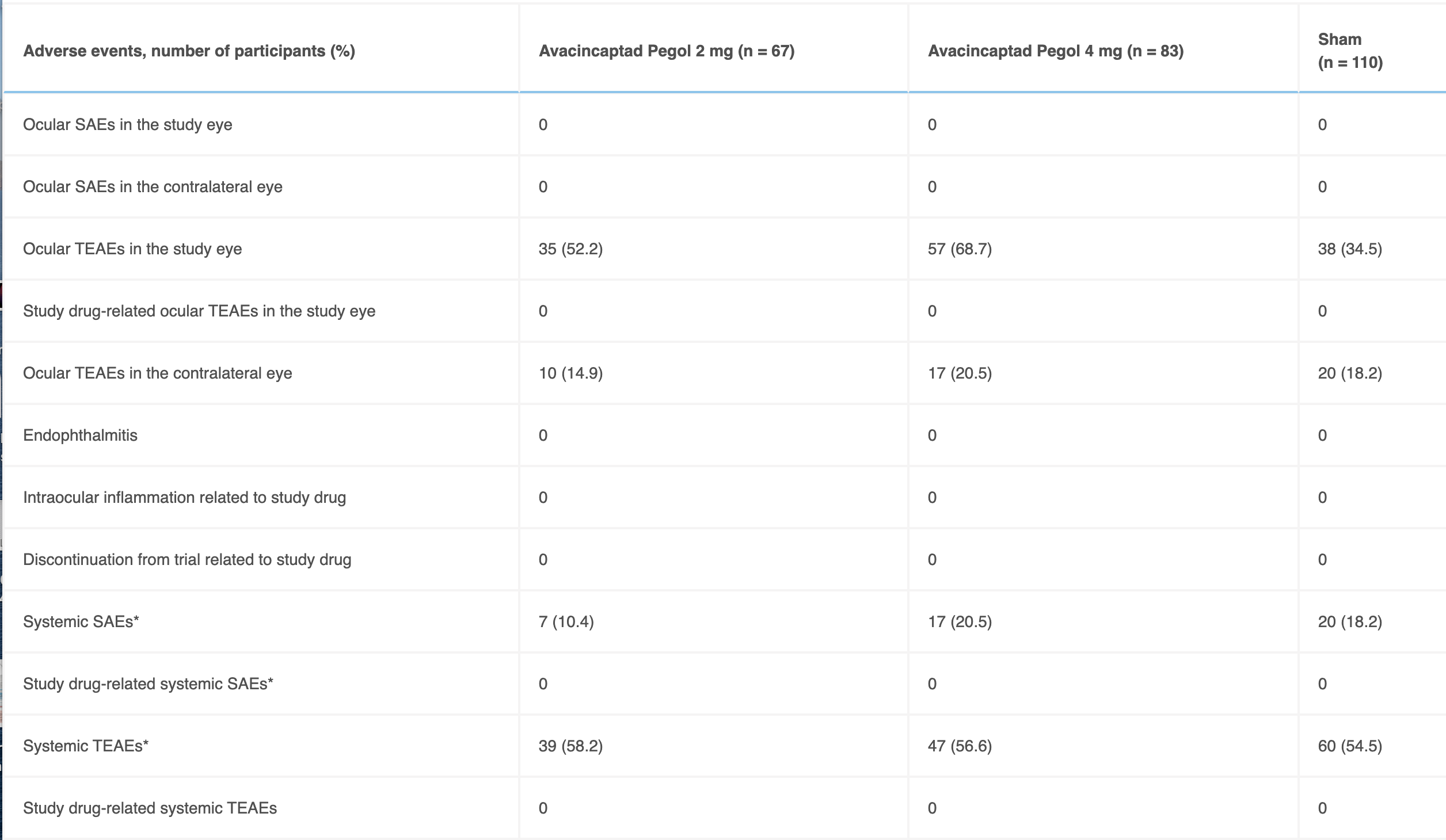 Choroidal neovascular membrane (CNV) was reported by the investigators in the fellow eyes of 10 (3.5%) participants, in the study eye of 3 (2.7%) participants in the sham cohort, 1 (4%) patient in the avacincaptad pegol 1 mg cohort, 6 (9.0%) participants in the avacincaptad pegol 2 mg cohort, and 8 (9.6%) participants in the avacincaptad pegol 4 mg cohort. At the time of the design of the trial, it was thought that the development of CNV would hinder accurate FAF measurement analysis, and therefore participants who developed CNV during the trial were discontinued from the study.