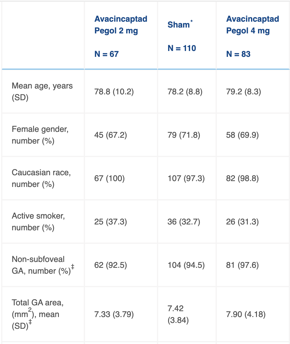 All efficacy analyses were conducted for the intention-to-treat (ITT) population. The ITT population consisted of all randomized subjects who received at least one dose of the assigned treatment, sham, avacincaptad pegol 1mg, avacincaptad pegol 2 mg, or avacincaptad pegol 4 mg.