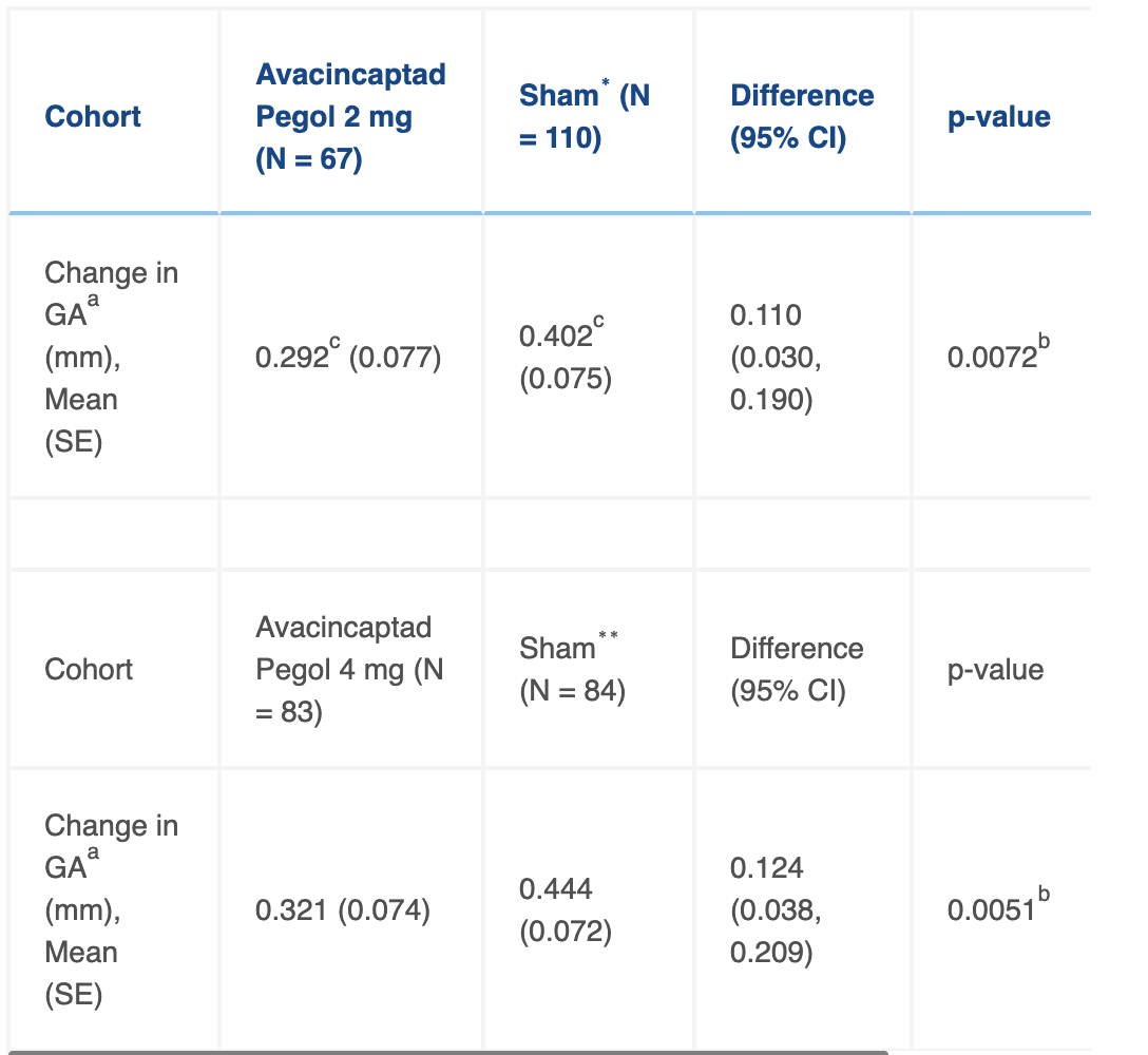 CohortAvacincaptad Pegol 2 mg (N = 67)Sham∗ (N = 110)Difference (95% CI)p-value% DifferenceChange in GAa (mm), Mean (SE)0.292c (0.077)0.402c (0.075)0.110 (0.030, 0.190)0.0072b27.4%CohortAvacincaptad Pegol 4 mg (N = 83)Sham∗∗ (N = 84)Difference (95% CI)p-value% DifferenceChange in GAa (mm), Mean (SE)0.321 (0.074)0.444 (0.072)0.124 (0.038, 0.209)0.0051b27.8%
