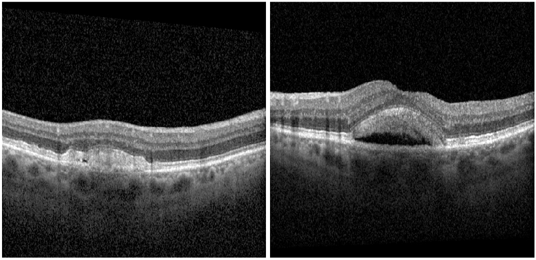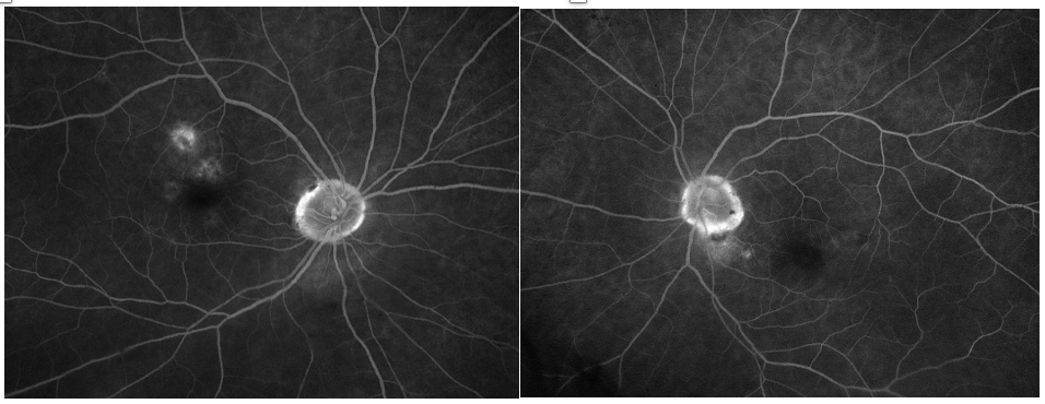 An 81-year-old white male presented with a complaint of gradual distortion in their central vision. The patient’s referring ophthalmologist noted a concern for neovascular age-related macular degeneration. The patient’s visual acuity was 20/30 OD and 20/25 OS. OCT of the right eye showed RPE elevation consistent with drusen and highly reflective, subretinal lesion. OCT of the left eye demonstrated a larger, highly reflective and well-circumscribed, homogenous subretinal (pseudo-vitelliform) lesion with an underlying optically empty zone. Fundus autofluorescence (FAF) imaging disclosed hyperfluorescence corresponding to the areas of RPE irreuglarities and pseudovitelliform lesions in both eyes. Fluorescein angiography (FA) was performed to differentiate the optically empty zone from subretinal fluid associated with a choroidal neovascular membrane (CNVM). FA showed macular staining consistent with drusen and no hyperfluorescence consistent with leakage, indicating the absence of a CNVM. The patient was diagnosed with adult onset foveomacular vitelliform dystrophy with a plan to observe every six months.