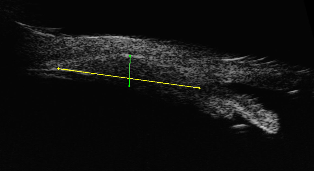 The spotted area of concern was so anterior in the eye that the corresponding internal area could not be easily examined with routine dilation, and a specialized ultrasound was performed to evaluate the internal structure of the wall of the eye. This “anterior b-scan” detected an abnormality. Underneath the pigmented spots of the sclera a tissue mass was found in the ciliary body, which is a ring like anterior structure which is located behind the iris and limbus. She was diagnosed with a melanoma of the ciliary body which was connected to the pigmented spots of the surface.