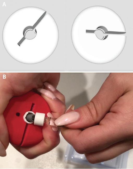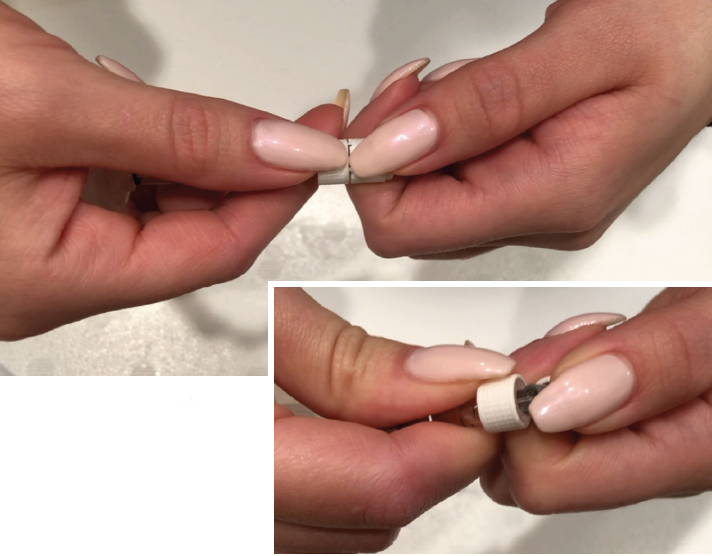 The use of a PFS has been associated with a reduced rate of endophthalmitis. It allows physicians to eliminate several steps from the preparation and administration process, including disinfecting the vial, attaching a filter needle to draw up medication, and removing this needle and replacing it with an injection needle.6 These capped syringes come filled with 0.165 mL of ranibizumab at the indicated concentration. To prepare the drug for administration, the physician or assistant snaps the cap off the syringe and attaches a sterile 30-gauge needle to administer the drug. The PFS, however, is modest in length (71.88 mm), and the cap measures 10.1 mm.5 These small sizes can make maintaining sterility difficult for individuals with large hands, gloved hands, and/or hands that have long fingernails (Figure 1).