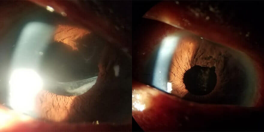 This patient moved significantly during cataract surgery and had significant damage to his iris with fragments of his cataract falling to the back of the eye before being referred to Colorado Retina (left). After surgical treatment with a vitrectomy, lensectomy (removal of cataract fragments), iris repair, and scleral fixation of an intraocular lens he fully recovered his vision and his iris anatomy was significantly improved (right).