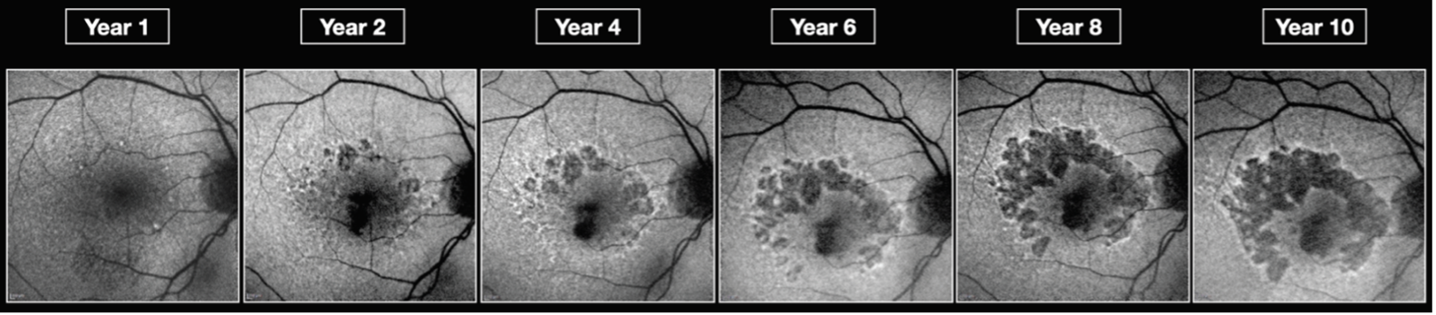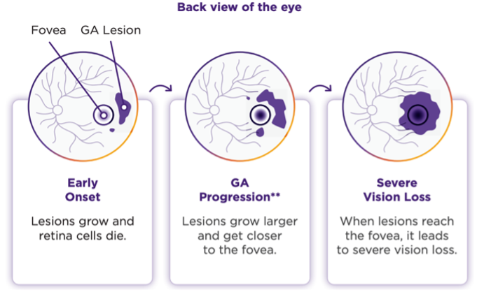 GA affects everyone differently and can be unpredictable, especially when it comes to speed of progression. From time of diagnosis, it can take on average about 2.5 years for GA to spread to the center of the retina, the fovea. When GA reaches the fovea, it can lead to a significant loss of central vision and, eventually, legal blindness.